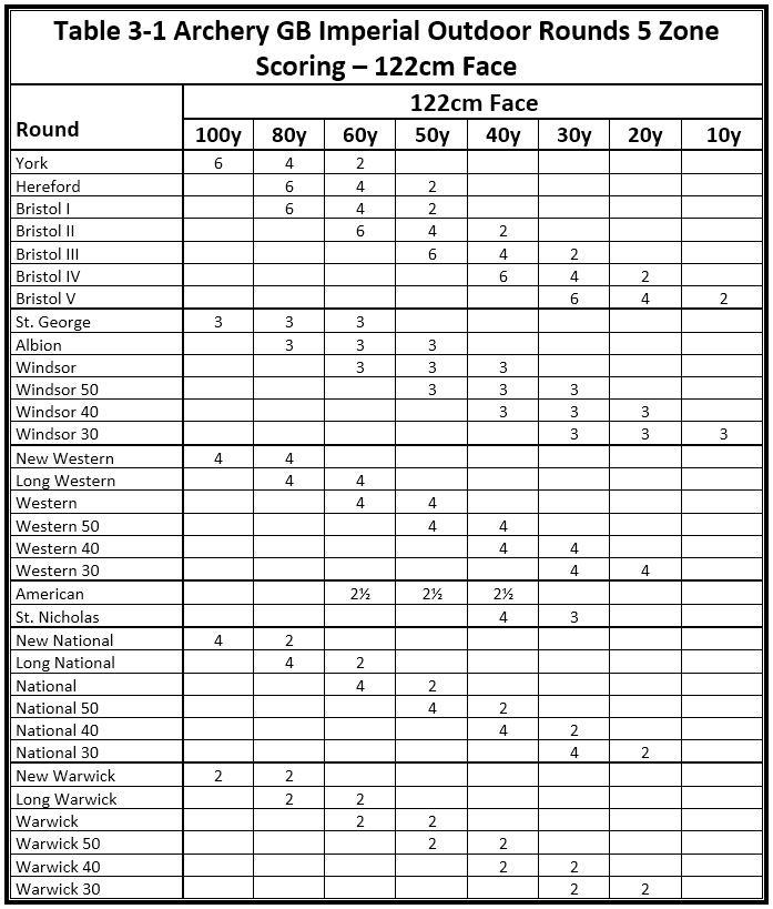 Outdoor rounds differ from indoor rounds, in that they can be shot over multiple distances - with a certain number of arrows at each distance, or a set number of arrows at a specified distance, up to 100 yards ! Click here to see a table of all the different Imperial rounds. Table is from the Archery GB "Rules of Shooting (Table 3-1, Apr 2022 edition)". Imperial rounds use different scoring from "normal" indoor (or outdoor metric rounds), with scoring being :