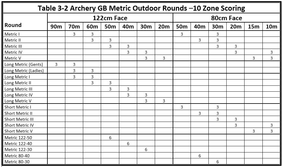 Metric rounds are shot at distances of metres, instead of yards. Like Imperial rounds, they have Long and Short versions, but confusingly, each can have several different options. The rounds below are a sample of what is available and all rounds use 10-zone scoring. Click here to see a full list of all of the Metric outdoor rounds. Table is from the Archery GB "Rules of Shooting (Table 3-2, Apr 2022 edition)".